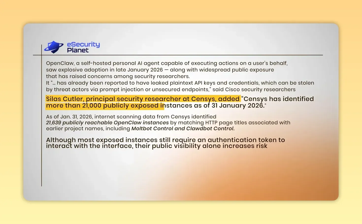 Censys finding highlighted: 21,000+ publicly exposed OpenClaw instances.